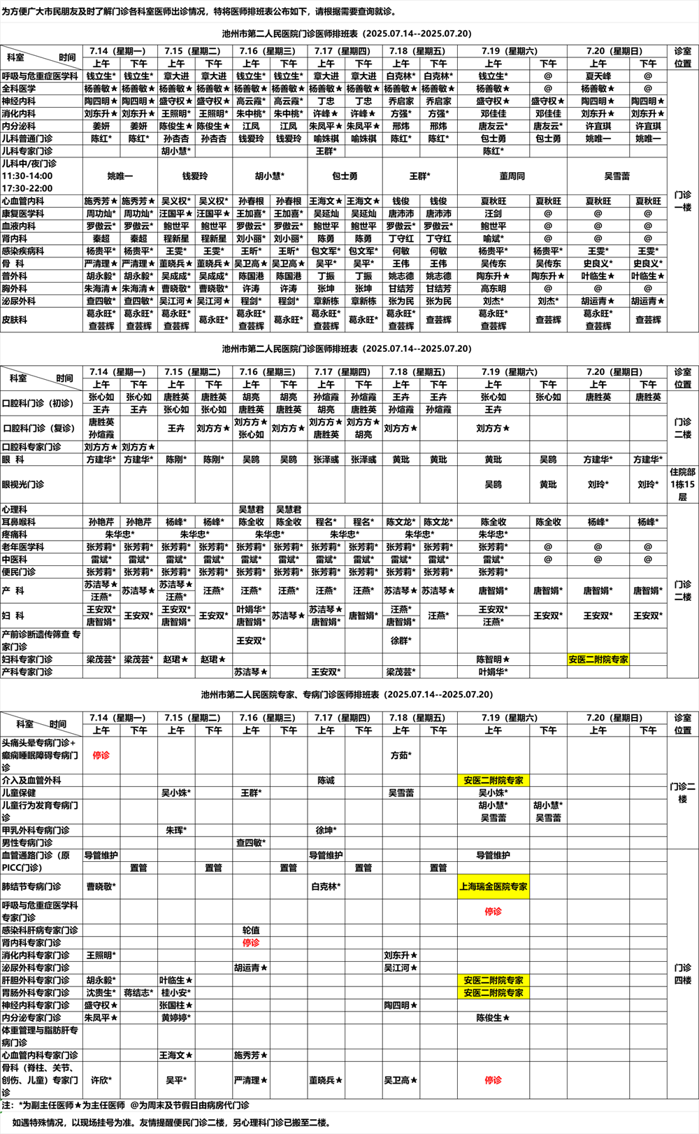 池州市第二人民医院门诊医师排班表(2025.07.14--2025.07.20)