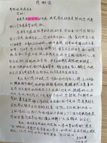 在这个信息化的时代,一笔一划的手写文字显得尤为珍贵。近日,我们收到了一封患者家属的手写信。信纸不长,却字字情深;言语朴实,却力透纸背。字里行间洋溢着患者及家属对胸外科主治医师许涛的感激与敬意。这封感谢信不仅是对许涛医生个人的高度赞扬,更是对我院胸外科全体医护人员医疗服务和人文关怀的充分肯定。