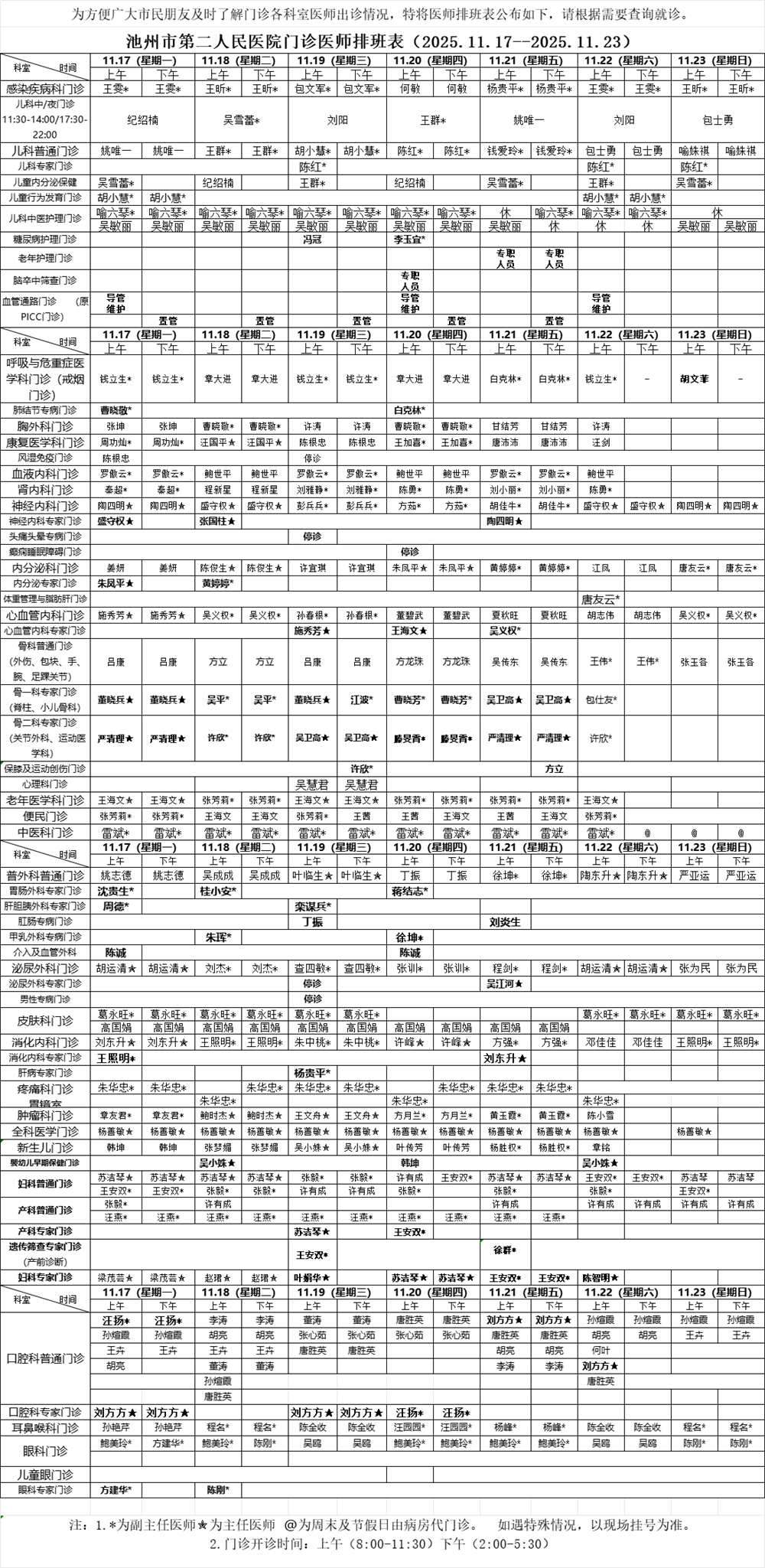 池州市第二人民医院门诊医师排班表(2025.11.17--2025.11.23)