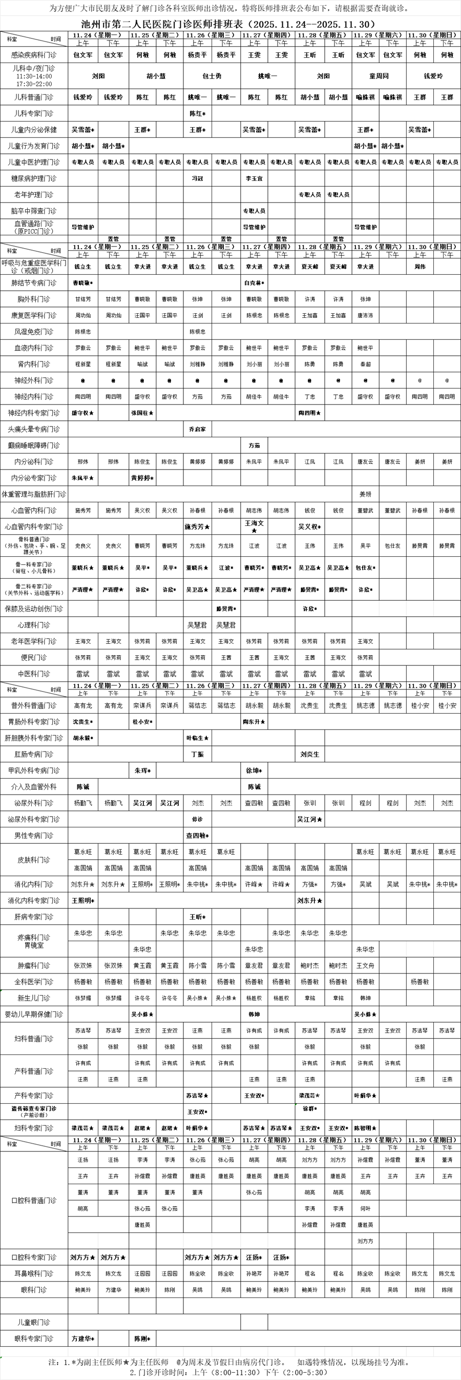 >> 池州市第二人民医院门诊医师排班表(2025.11.24--2025.11.30)
