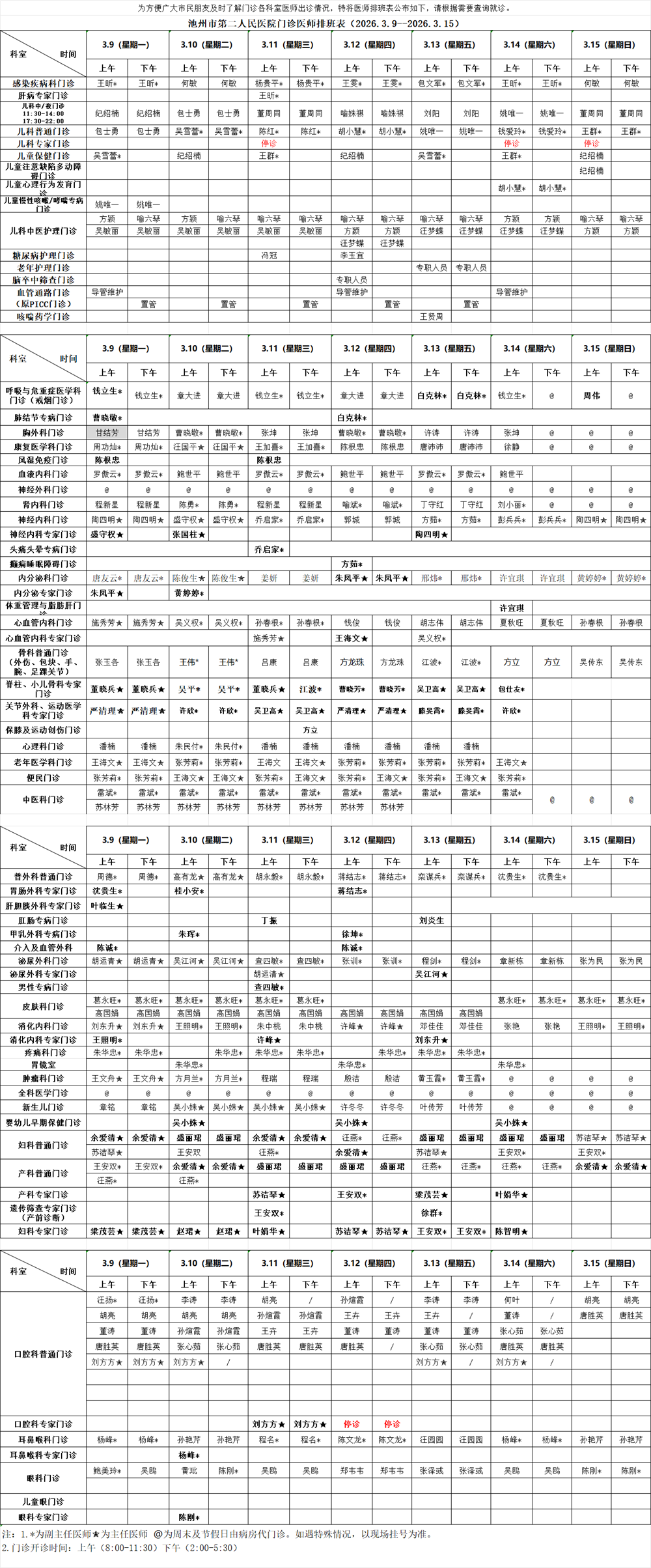 >> 池州市第二人民医院门诊医师排班表(2026.3.9--2026.3.15)