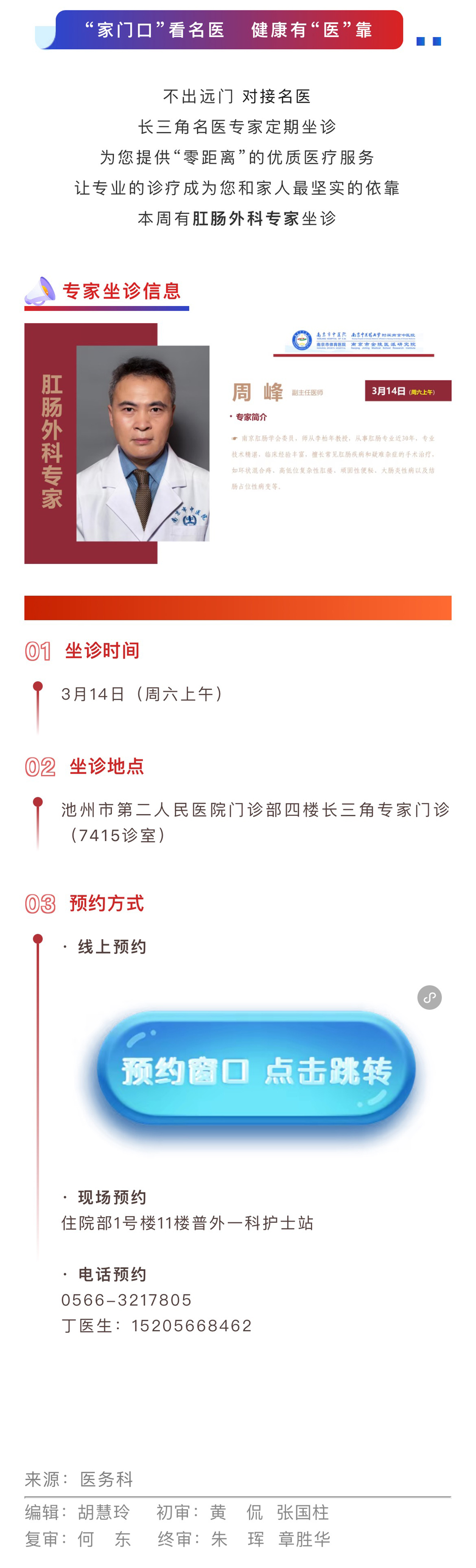 【专家坐诊】3月14日,全国肛肠专科医疗中心——南京市中医院肛肠中心周峰主任坐诊我院