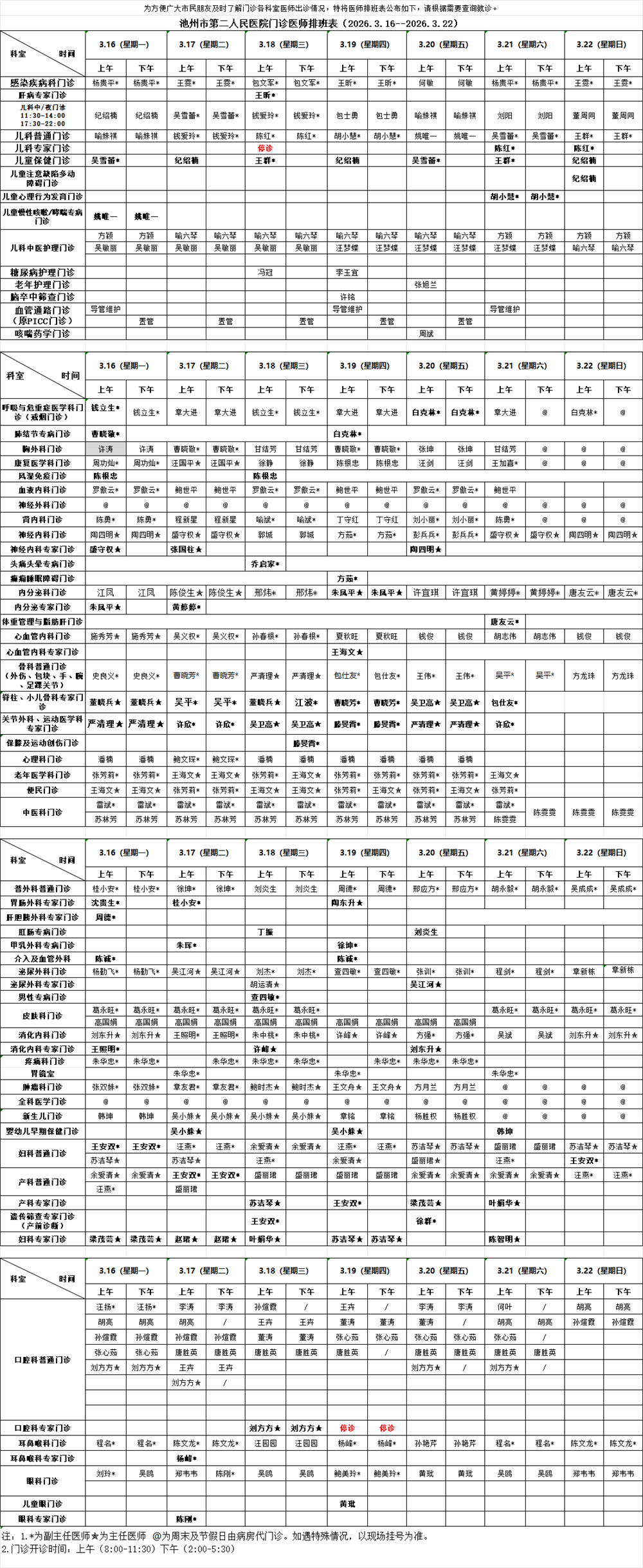 >> 池州市第二人民医院门诊医师排班表(2026.3.16--2026.3.22)