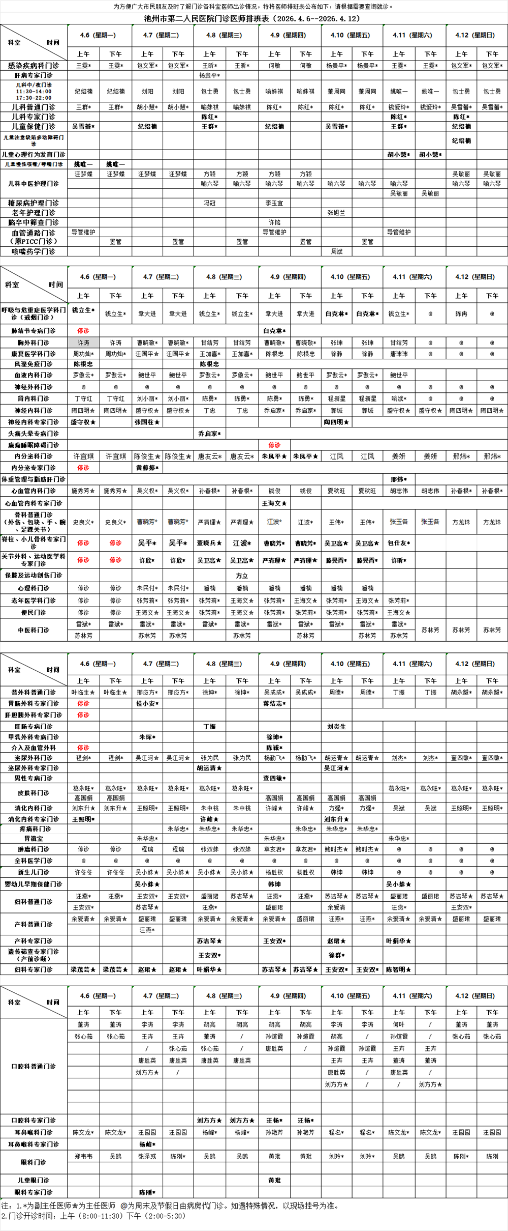 >> 池州市第二人民医院门诊医师排班表(2026.4.6--2026.4.12)