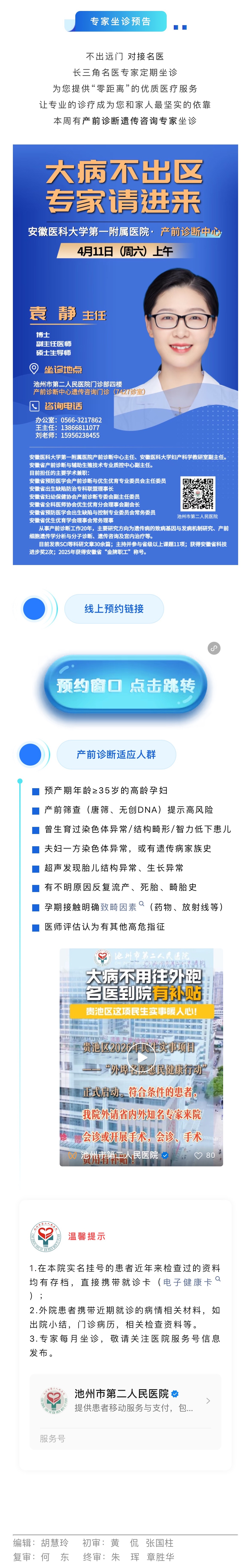【名医坐诊】4月11日,安徽医科大学第一附属医院产前诊断中心主任袁静坐诊我院