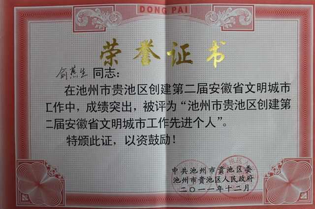 >> 俞燕生院长荣获“贵池区创建第二届安徽省文明城市先进个人”
