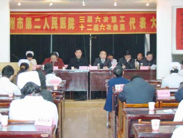 2008年2月22日,市二院召开三届六次职工代表大会。会议在雄壮的国歌声中拉开帷幕。俞燕生院长代表医院领导班子作《医院工作报告》。区卫生局长方忠生、区总工会主席桂卫兵到会祝贺。