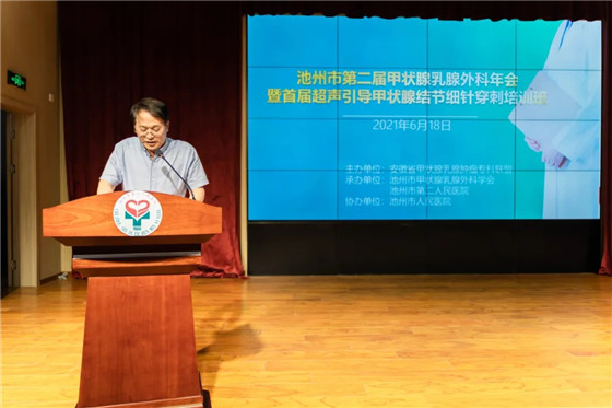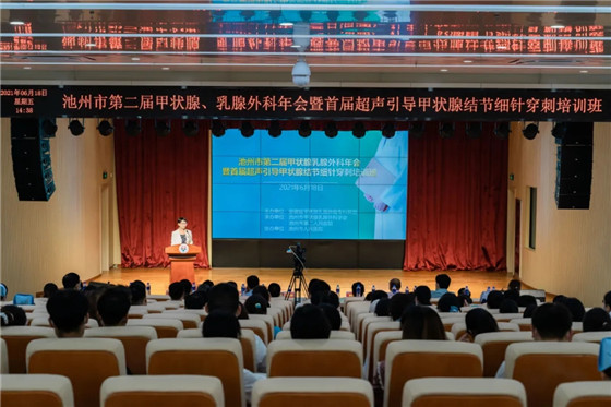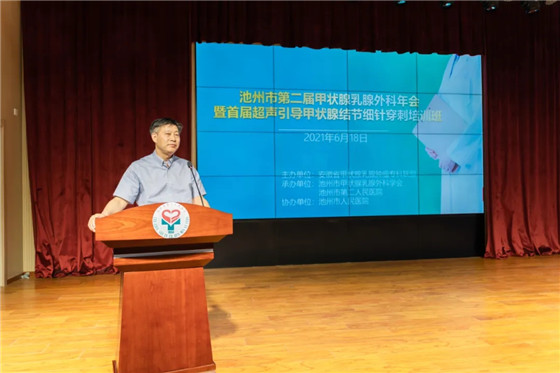 6月18日,由安徽省甲状腺乳腺肿瘤专科联盟主办,池州市甲状腺乳腺外科学会、池州市第二人民医院承办,池州市人民医院协办的池州市第二届甲状腺乳腺外科学术年会暨首届超声引导甲状腺结节细针穿刺培训班在我院学术报告厅顺利举行。