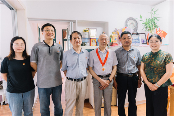 为庆祝中国共产党成立101周年,传递党的关怀和温暖,“七一”前夕,医院党委书记汪国平,党委副书记、院长陈仲琪,党办主任吴木兰、外科党支部书记左治强一行6人赴退休老党员童晓陆家中看望慰问,为其颁发“光荣在党50年”纪念章。