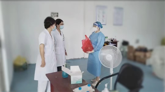 慰问中,杨主任向李星详细了解了核酸采样点工作开展情况,并叮嘱她做好防疫工作的同时,注意防暑降温,保证自身健康和安全。炎炎夏日,李星严格按照要求做好二级防护,身着一次性医用隔离衣,戴好面屏和手套,为群众进行核酸采样,尽管汗水浸湿衣服,确保了采样点核酸采样工作安全有序进行。李星表示,一定坚守岗位,践行好白衣天使的职责与担当,圆满完成院部交办的工作任务。