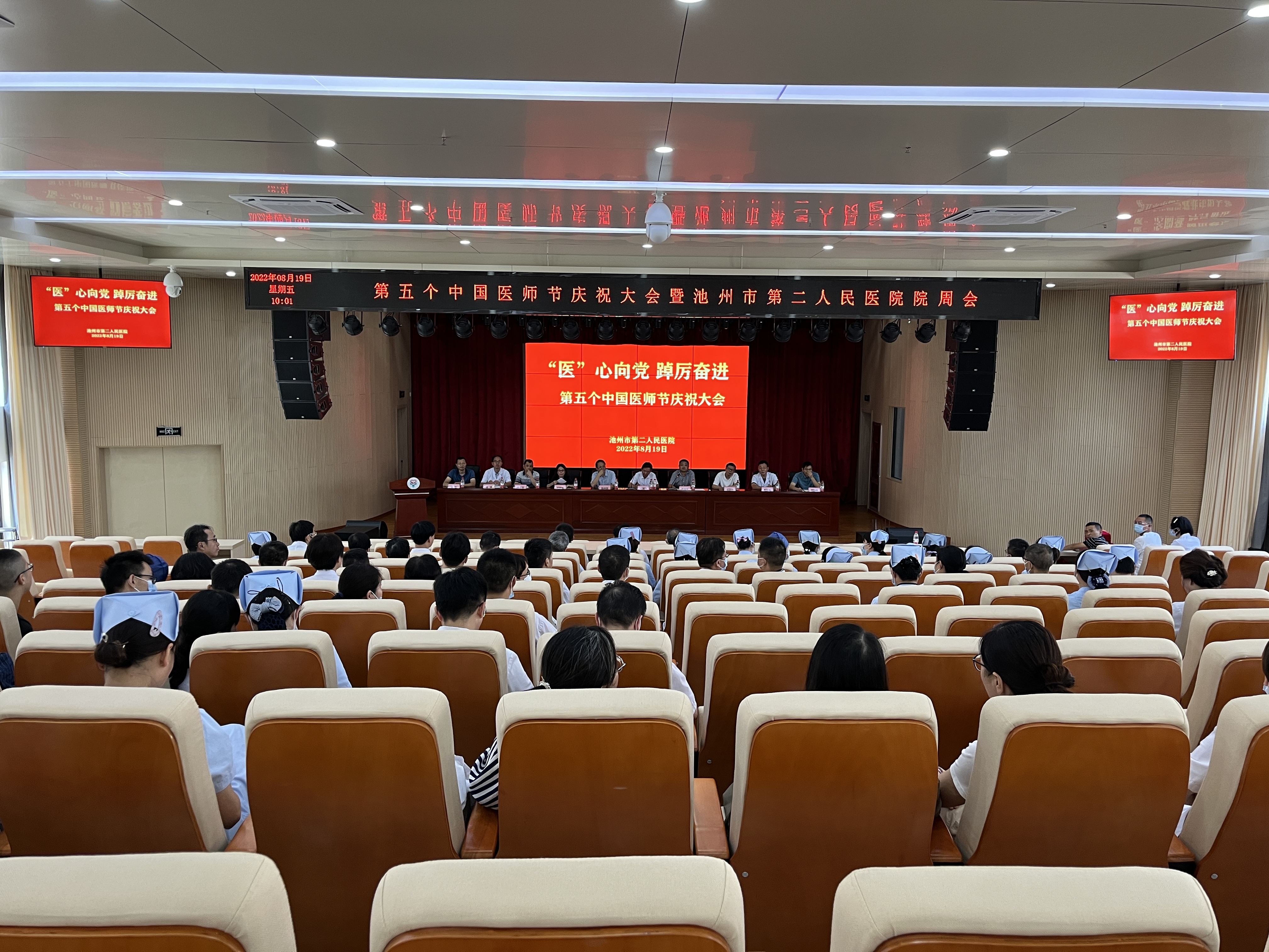 8月19号上午,在第5个中国医师节当天,我院召开以“‘医’心向党、踔厉奋进”为主题的庆祝大会暨院周会。院党政班子成员,全体中层干部出席了会议,会议由党委书记汪国平主持。区卫健委党组副书记方明文受邀出席会议并讲话。