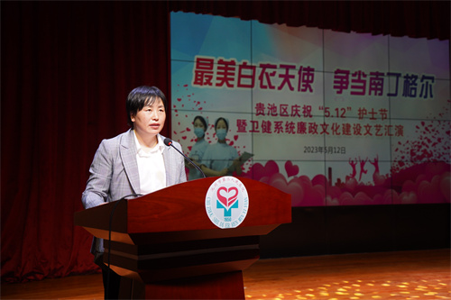 5月12日上午,贵池区庆祝“5·12”护士节暨卫健系统廉政文化建设文艺汇演在我院举行。区委常委、副区长汪赛荣,池州市卫健委一级调研员盛斌,区卫健委党组书记、主任方小亚,区委组织部、区纪委监委、区委宣传部、区卫健委、区医保局、区总工会、区文明办、区妇联、团区委相关同志受邀参加活动。