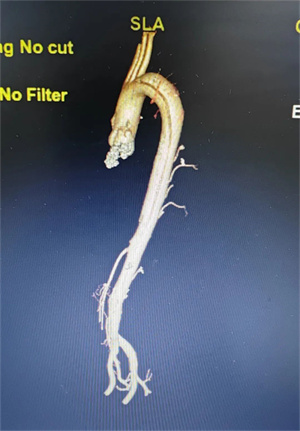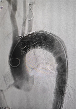 经过胸痛中心绿色通道排除心梗考虑夹层可能,经口服降压、镇痛稍好转后第一时间行急诊胸腹主动脉CTA,确诊为胸主动脉夹层,夹层从左侧锁骨下一直撕到左侧髂总动脉,真腔近乎只有假腔的1/4,病情十分凶险!急诊入住我院普外二科进一步监护治疗,治疗期间由于血压难以控制,夹层破裂风险进一步增高,需急诊手术进一步干预。经过科内讨论建议急诊行胸主动脉介入治疗。最终在介入中心、麻醉科、手术室的密切配合下,于2月1日下午在介入中心、麻醉科、手术室的密切配合以及上级专家的指导下完成了胸主动脉覆膜支架腔内隔绝术,术后造影可见左侧锁骨下动脉显影良好且无内漏,手术效果满意!