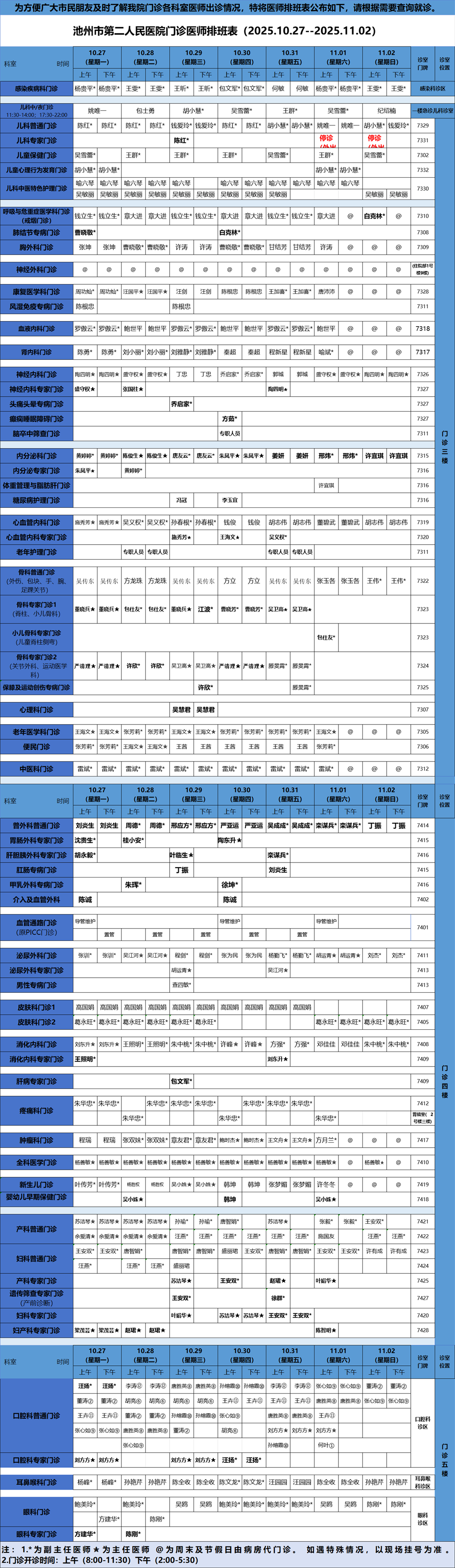 >> 池州市第二人民医院门诊医师排班表(2025.10.27--2025.11.02)